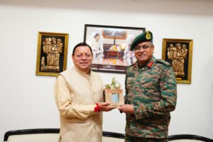 मुख्यमंत्री श्री पुष्कर सिंह धामी से गुरुवार को मुख्यमंत्री आवास में मध्य कमान के जनरल ऑफिसर कमांडिंग इन चीफ ( जीओसी इन सी) लेफ्टिनेंट जनरल अनिंद्य सेनगुप्ता ने शिष्टाचार भेंट की।