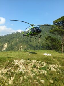 कुण्ड गांव के लिए हेली के 2 राउंड में 40 राशन किट तथा आवश्यकतानुसार सोलर लाइट दी गयी